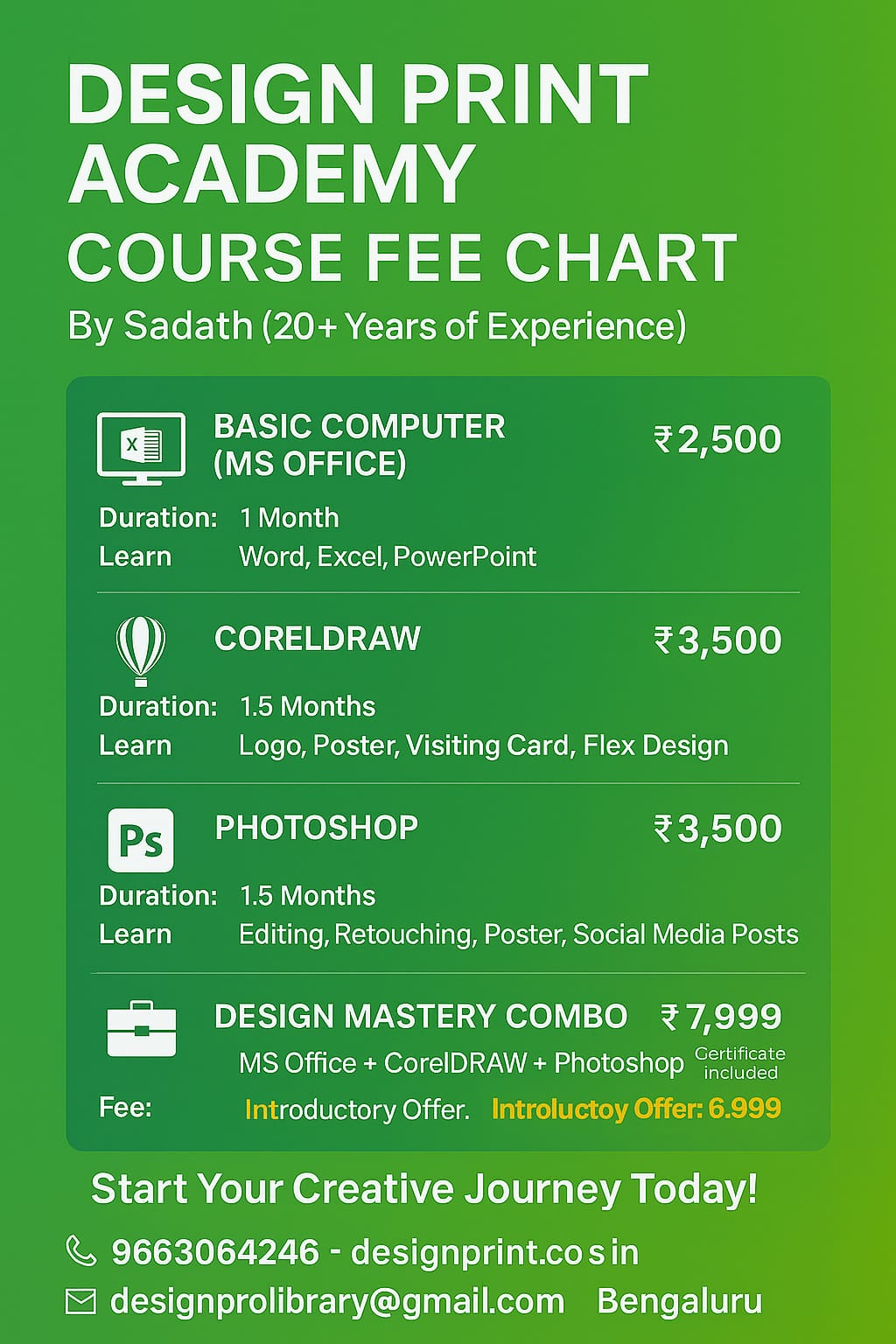Learn MS Office, CorelDRAW & Photoshop with real-world projects and guidance from 20+ years experienced trainers. Gain the confidence and skills needed for a job or freelance income — even as a beginner.